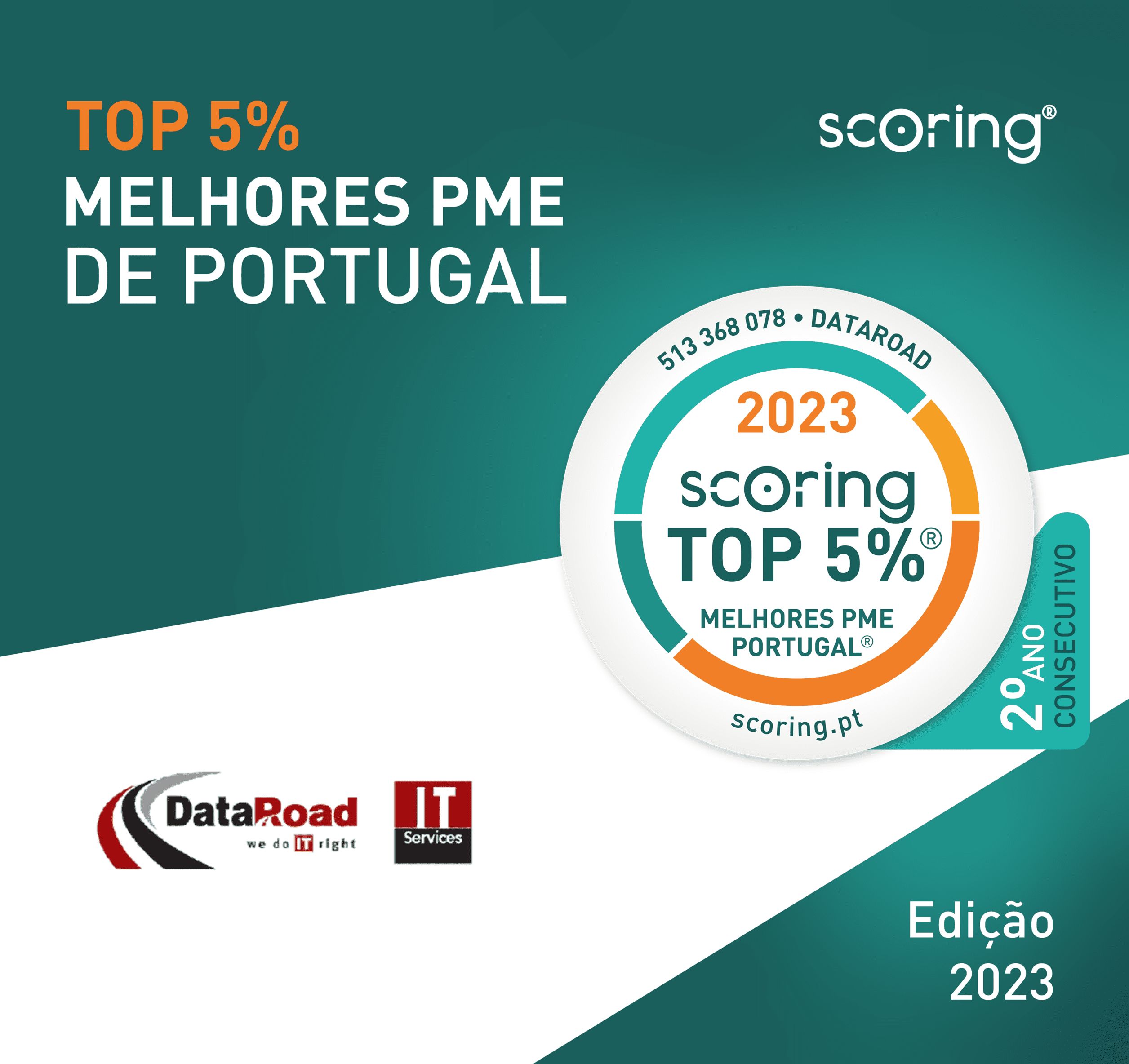 Por segundo año consecutivo, DataRoad cumplió los requisitos de acceso y presentó (según el método ScorePME) un Índice de Rendimiento y Fortaleza Financiera (IDS) "Excelente", demostrando una sostenibilidad financiera accesible sólo al 5% de las PYME portuguesas.
